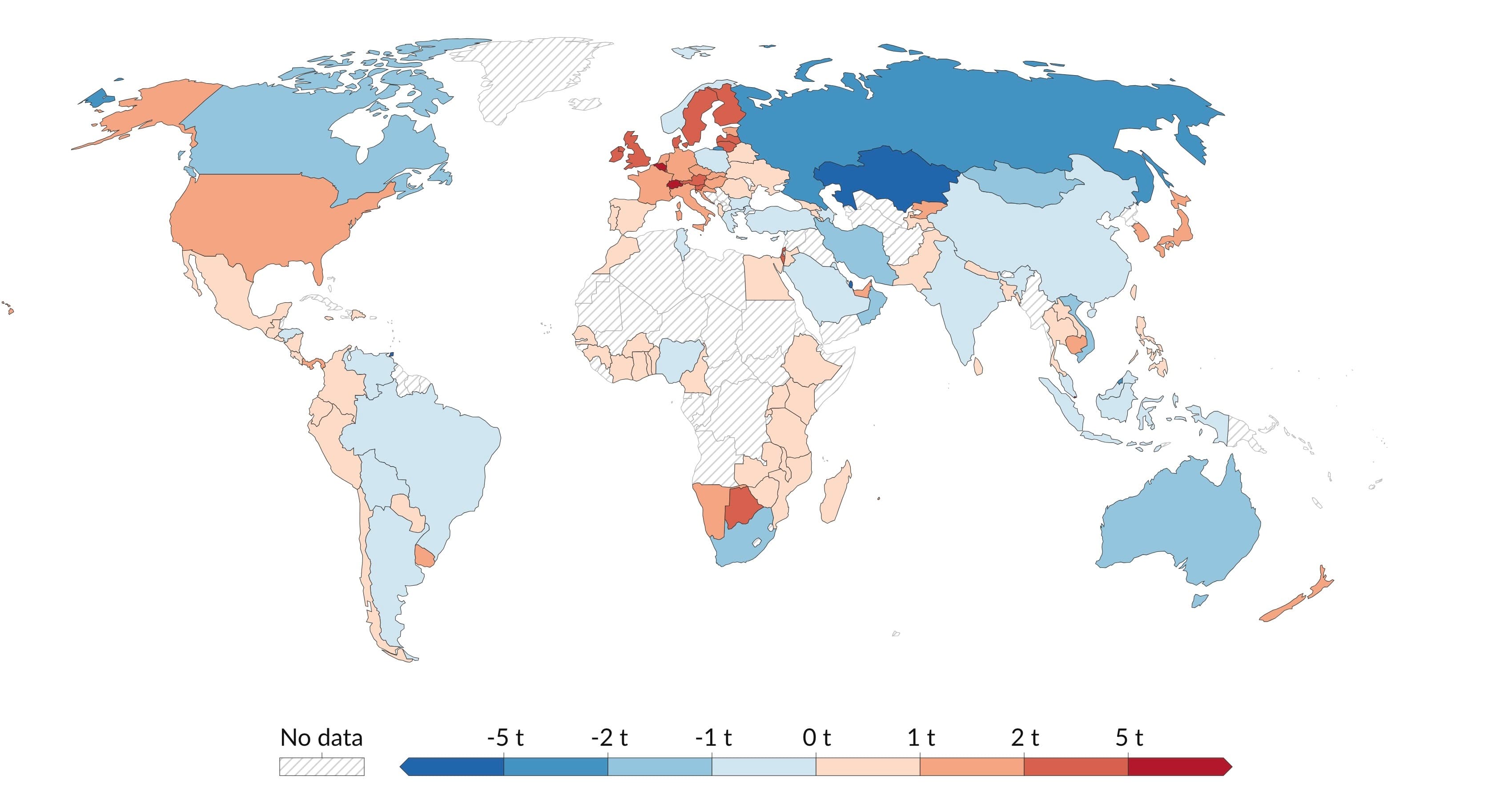 6 Die Schweiz gehört weltweit zu den Ländern mit den höchsten importierten Emissionen. Die Karte zeigt eindrücklich den Ländervergleich der Netto-Bilanz von Importen und Exporten in Tonnen CO₂ pro Kopf. Our World in Data, Imported or exported CO₂ emissions per capita; https://ourworldindata.org/grapher/imported-or-exported-co-emissions-per-capita (Zugriff: 5.6.2025)
