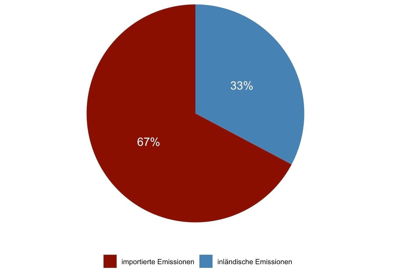 Gemäss Zahlen des Bundesamts für Statistik stammen mindestens zwei Drittel unserer gesamten Klimabelastung aus dem Ausland (2). Während die inländischen Emissionen seit 2000 immerhin um 23 % reduziert werden konnten, sind die importierten Emissionen im gleichen Zeitraum je nach Messung entweder kaum zurückgegangen oder sogar deutlich gestiegen. Während das Bundesamt für Statistik von einer Reduktion um knapp 1 % ausgeht, zeigt das Global Carbon Project gar eine Zunahme der importierten Emissionen von mehr als 30% (7).