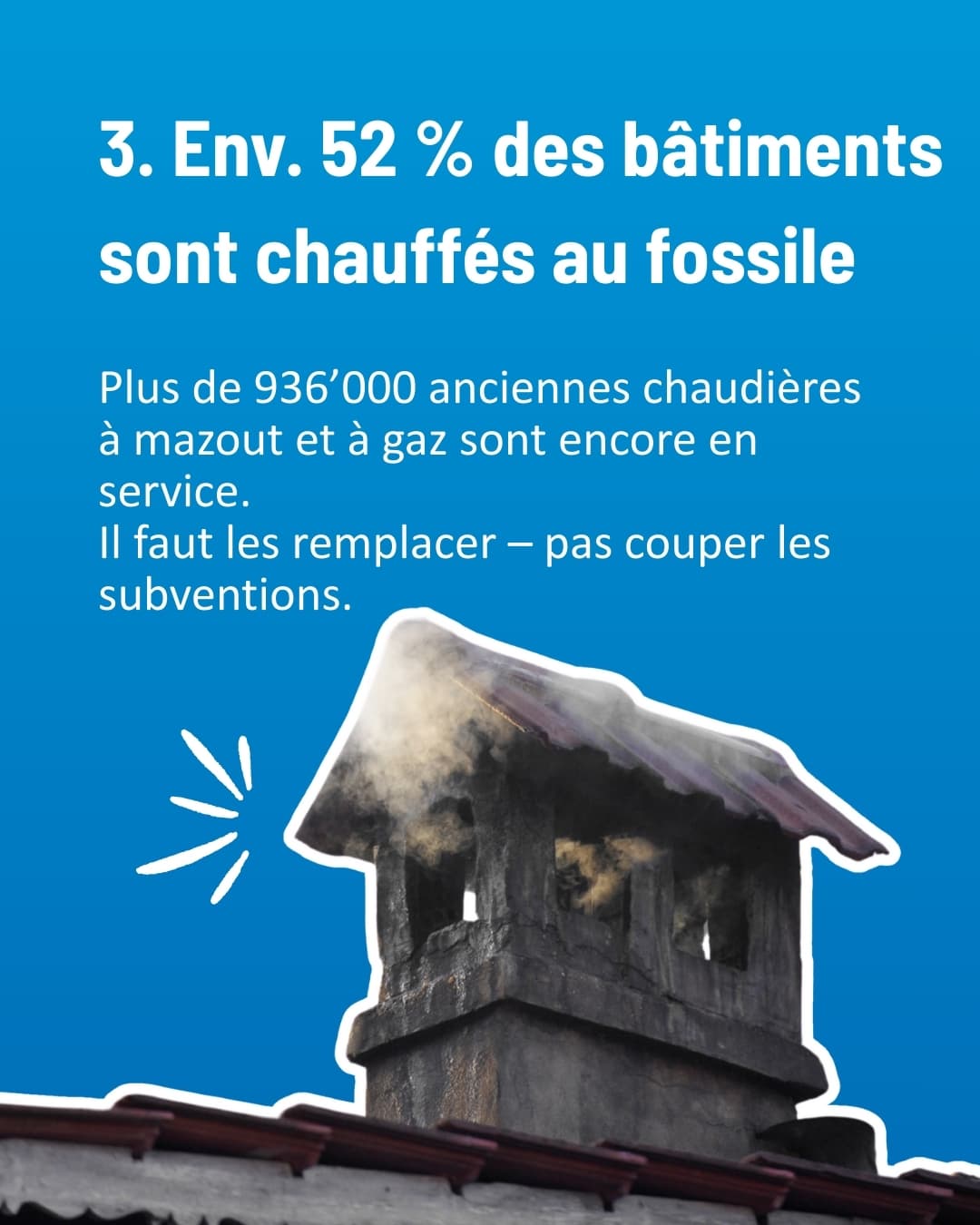 - Il existe encore au moins 936 000 installations de chauffage fossiles en Suisse (OFS 2025). Rien que l’année dernière, plus de 4 000 chauffages fossiles ont encore été installés.