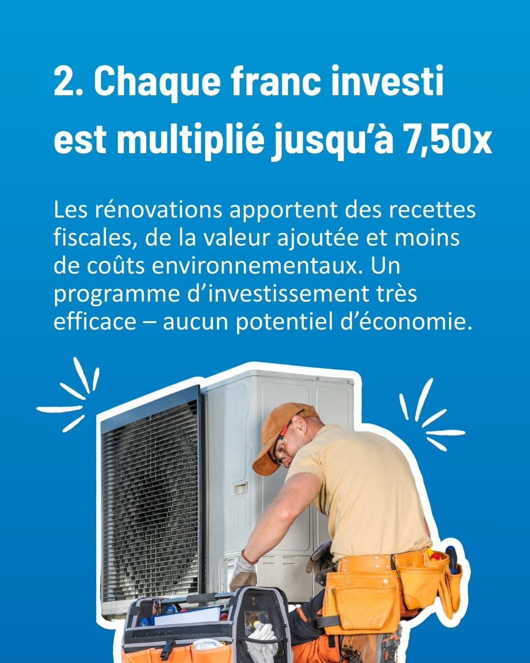 - Chaque franc de subvention génère un bénéfice économique pouvant atteindre 7,50 francs grâce aux recettes fiscales, à la valeur ajoutée supplémentaire et aux coûts environnementaux évités (étude EBP).