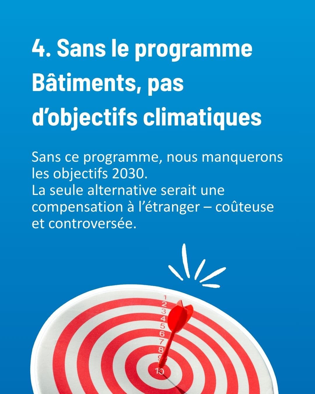- Le programme Bâtiments est indispensable pour atteindre les objectifs climatiques suisses : l’administration fédérale n’a présenté aucune alternative permettant d’atteindre les objectifs climatiques autrement. Si l’écart devait être comblé par des compensations à l’étranger, controversées, il faudrait acheter des certificats pour environ 400 millions CHF. Outre le fait que l’efficacité de ces projets est très incertaine, cela entraînerait des coûts importants.